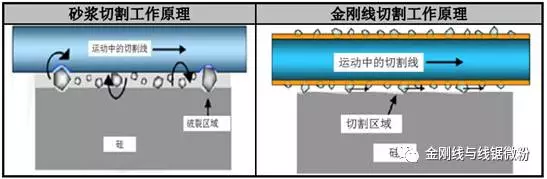 砂漿切割是游離磨料切割,其磨料(切割液和碳化硅混合形成的砂漿)隨著高速運動的切割線而“滾動-嵌入”切割線和硅材料之間達到切割效果。金剛線切割是固定磨料切割,是將磨料(金剛石顆粒)直接固著于切割線,并隨著高速運動的切割線直接劃過硅材料以達到切割效果。兩種切割技術對比如下圖所示: