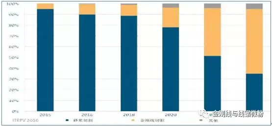 金剛線主要用于光伏硅材料、藍寶石等硬脆材料切割,而該等材料的主要傳統切割方式為砂漿切割。因此,金剛線行業的市場空間主要取決于兩個因素:一是金剛線對傳統砂漿切割的替代程度,二是光伏行業、藍寶石行業的發展狀況。