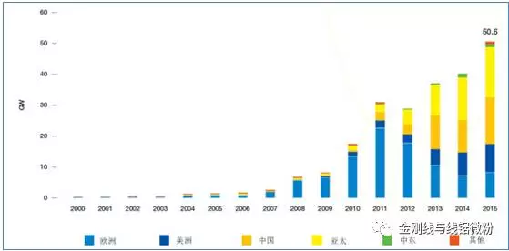 作為新興產業,光伏行業近年來發展迅猛。全球光伏累計裝機容量由 2000年的 1,288MW增至 2015年的 229.3GW,年復合增長率達 41.26%; 全球光伏年新增裝機容量也保持較快增長趨勢, 由2000年的293MW增至2015年的50.6GW, 年復合增長率達40.98%。 下圖為2000-2015年全球新增裝機容量(單位:MW,即 106W,10-3GW)。