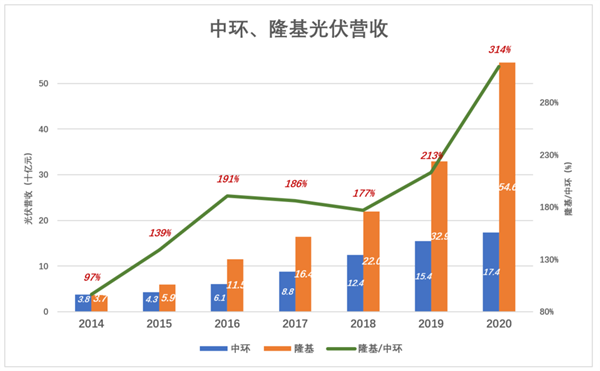 2018年,隆基營收(shou)相當(dang)于中環(huan)光伏業(ye)務收(shou)入的213%,2020年這個比例擴大到314%。