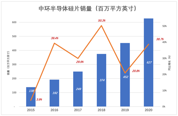 “十三五”期間(2016~2020年),中環的主攻方向是8-12英寸集成電路拋光片。2016年銷(xiao)量(liang)近2億(yi)平方英寸(cun),同(tong)比增(zeng)長39.4%;2018年銷(xiao)量(liang)3.7億(yi)平方英寸(cun),同(tong)比增(zeng)長50.3%;2020年銷(xiao)量(liang)達6.3億(yi),同(tong)比增(zeng)長38.7%。