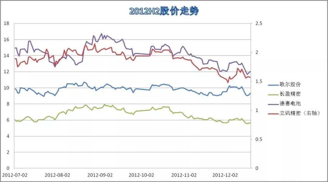 2012Q2之后,立(li)訊精密(mi)、長盈精密(mi)、德賽電池等公(gong)司(si)紛紛披露業績,市場給出的(de)(de)(de)解讀是不及預期,隨(sui)后股價便(bian)經歷了持續3-4個月的(de)(de)(de)調整,相(xiang)關公(gong)司(si)的(de)(de)(de)跌幅都(dou)在30%左右(you)。作(zuo)為對(dui)比,業績符(fu)合預期的(de)(de)(de)歌爾(er)股份的(de)(de)(de)走勢就(jiu)相(xiang)對(dui)平(ping)穩(wen)。