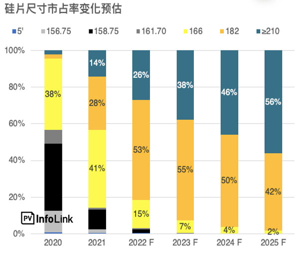 2021年年底,大尺寸組件產(chan)能(neng)超(chao)過290GW,210首(shou)超(chao)過182(來源:PV InfoLink)