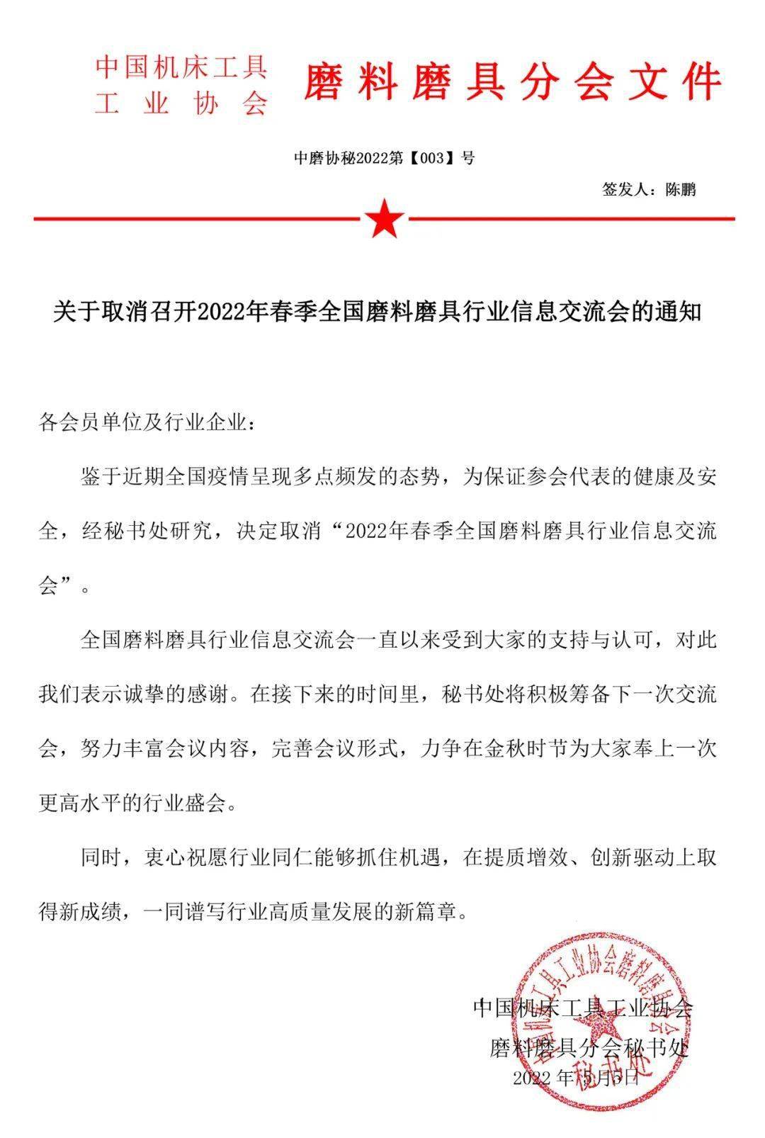 鑒于近期全國疫情呈現多點頻發的態勢,為保證參會代表的健康及安全,經秘書處研究,決定取消“2022年春季全國磨料磨具行業信息交流會”。