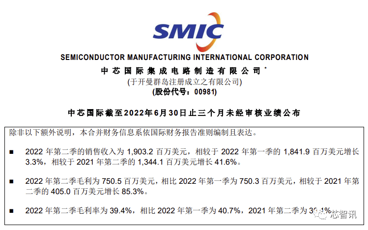 8月11日晚間,中芯國際發布了未經審核的2022年第二季(ji)度財報,營(ying)收(shou)達(da)19.032億美元,同比(bi)增長41.6%;毛利達(da)7.505億美元,同比(bi)增長85.3%,毛利率(lv)為39.4%。