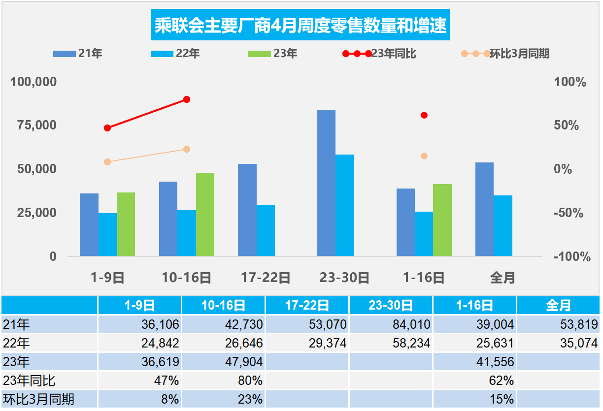 4月1-16日,乘用車市場零售66.5萬輛,同比去年(nian)(nian)同期增長(chang)62%,較上(shang)月同期增長(chang)15%;今年(nian)(nian)以來累計零售495萬輛,同比下降7%;全國乘用車廠商(shang)批發54.8萬輛,同比去年(nian)(nian)同期增長(chang)44%,較上(shang)月同期下降12%;今年(nian)(nian)以來累計批發560.9萬輛,同比下降4%。