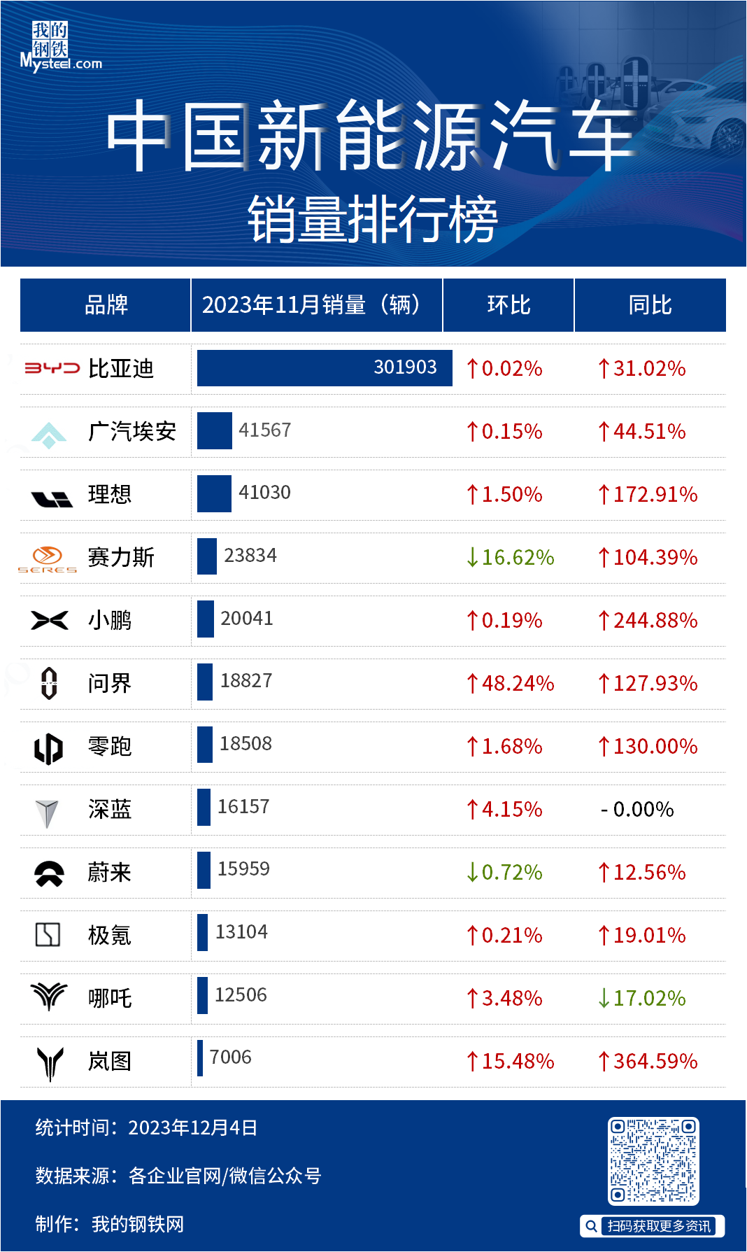 摘要 據Mysteel統計,截至12月4日,12家新能源汽車企業發布2023年11月新能源汽車銷量數據。其中,理想汽車11月共計交付新車41030輛,同比增長173%,連續兩個月實現了交...