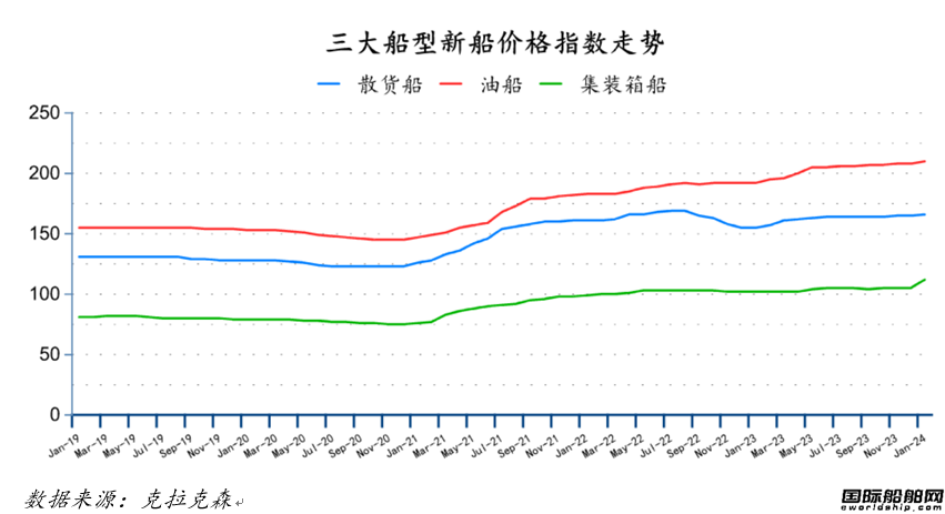 1月(yue)份散(san)貨船(chuan)(chuan)、油(you)船(chuan)(chuan)和集(ji)裝箱船(chuan)(chuan)新船(chuan)(chuan)價(jia)格指數分別環(huan)比上升(sheng)1點、2點、7點至(zhi)166點、210點、112點。
