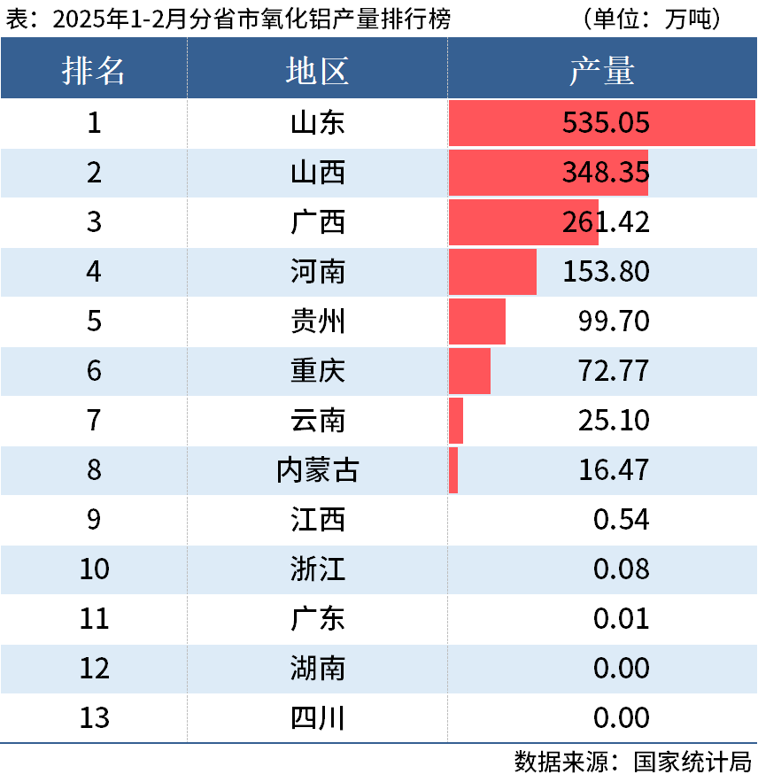 從分省市數據來看(kan),1-2月,山東以產量(liang)(liang)535.05萬(wan)噸位列第一,山西產量(liang)(liang)348.35萬(wan)噸排在第二,廣西產量(liang)(liang)261.42萬(wan)噸排在第三(san),具體情況如下: