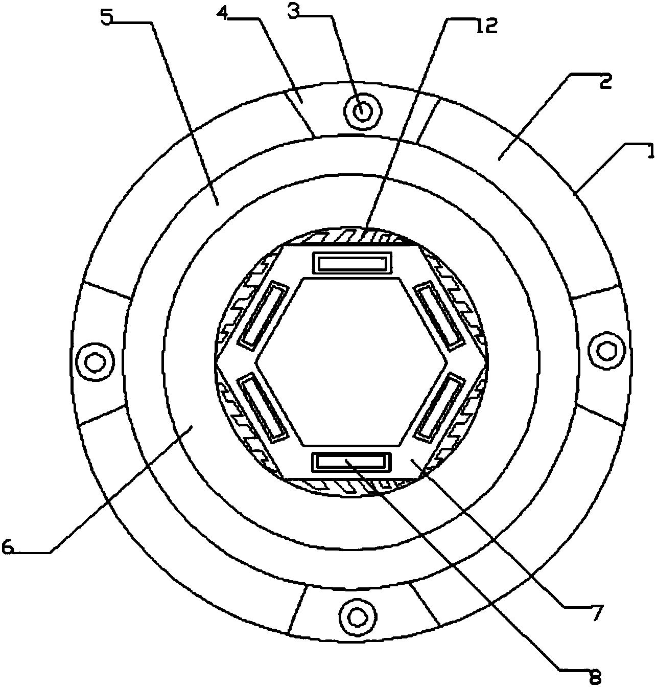 1.一種研磨醫療用鈦合金的陶瓷砂輪,包括外殼(1),其特征在于:所述外殼(1)的外表面往外殼(1)的中心位置依次設置有金剛石層(2)、減振環(5)和絕熱層(6),所述金剛石層(2)上固定有四個鋼塊(4),四個鋼塊(4)對稱設置且鋼塊(4)的中部開有螺紋孔(3),所述金剛石層(2)內由磨砂塊(9)和球形陶瓷(10)組成,所述絕熱層(6)為圓環設計且通過粘合劑(12)內接有一六角固定框(7),所述六角固定框(7)當中固定有六個對稱設置的連接塊(8),所述連接塊(8)內側為鋸齒紋(11)設計。