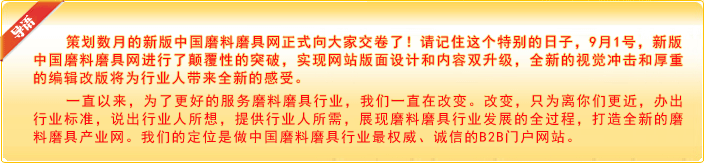 新版磨料磨具網重新規劃、重新設計制作、加大商務內容的投入,使其作為行業門戶網站更具有說服力。磨料磨具網經過多日努力,整合本站技術能力、資源優勢,將為行業企業推出全方位互聯網營銷解決方案和平面營銷解決方案。...鏈接全文